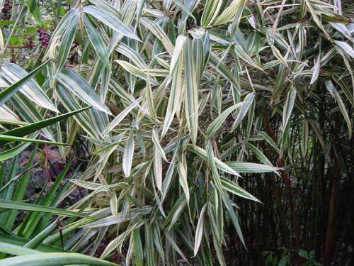 The Shiroshima form appeared 3 years after Hibanobambusa t. Kimmei flowered in 1974. Shiroshima has strikingly attractive leaves, variegated in cream and white stripes of varying widths which sometimes show shades of pink or purple when young. The variegated colors persist throughout the year.